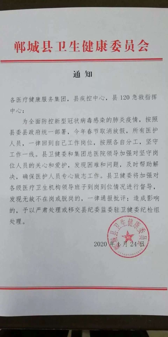 在全國疫情防控形勢較為嚴(yán)重情況下,衛(wèi)健委充分認(rèn)識到加強(qiáng)新型肺炎疫情防治工作的重要性和急迫性,于1月24下發(fā)取消全縣醫(yī)護(hù)人員春節(jié)假期的通知。要求所有醫(yī)護(hù)人員,一律回到自己工作崗位,按照各自分工,堅守工作一線。