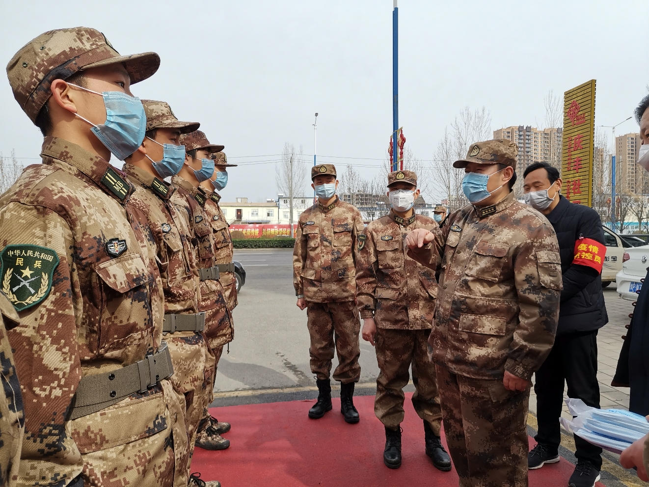 在慶豐社區(qū)佳利德苑小區(qū)門口,由10余名預征青年組成的“青年志愿服務隊”正在巡邏。史永剛是河南農(nóng)業(yè)大學的應屆畢業(yè)生,他從小就有一個當兵的夢想,疫情面前,他積極響應辦事處武裝部的號召,自愿加入到疫情防控應征青年志愿服務隊中。王善沖詢問他們防疫執(zhí)勤情況,囑咐他們在巡邏的同時要注意自身防護,并為他們送上防疫口罩。