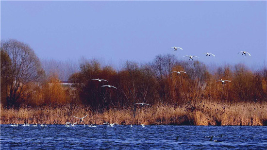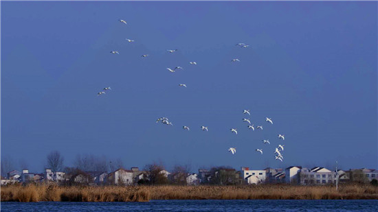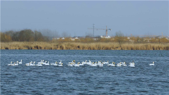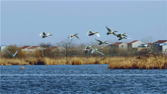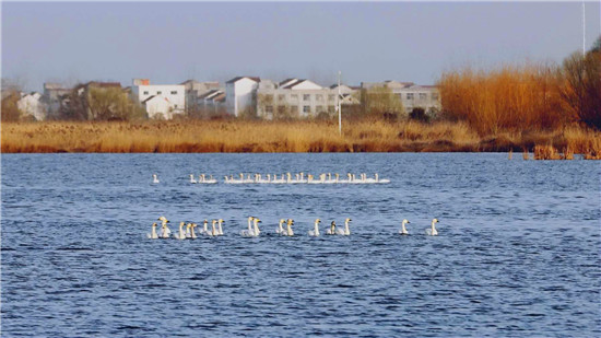 據(jù)在淮陽龍湖北岸疫情卡點值守的安保人員王寶峰介紹,除了這一批50多只白天鵝來龍湖歇腳外,幾天前的2月18日,還有100多只白天鵝在太昊陵前廣場上空盤旋一圈后飛到了龍湖,在龍湖停留一天后向北方遷徙了。