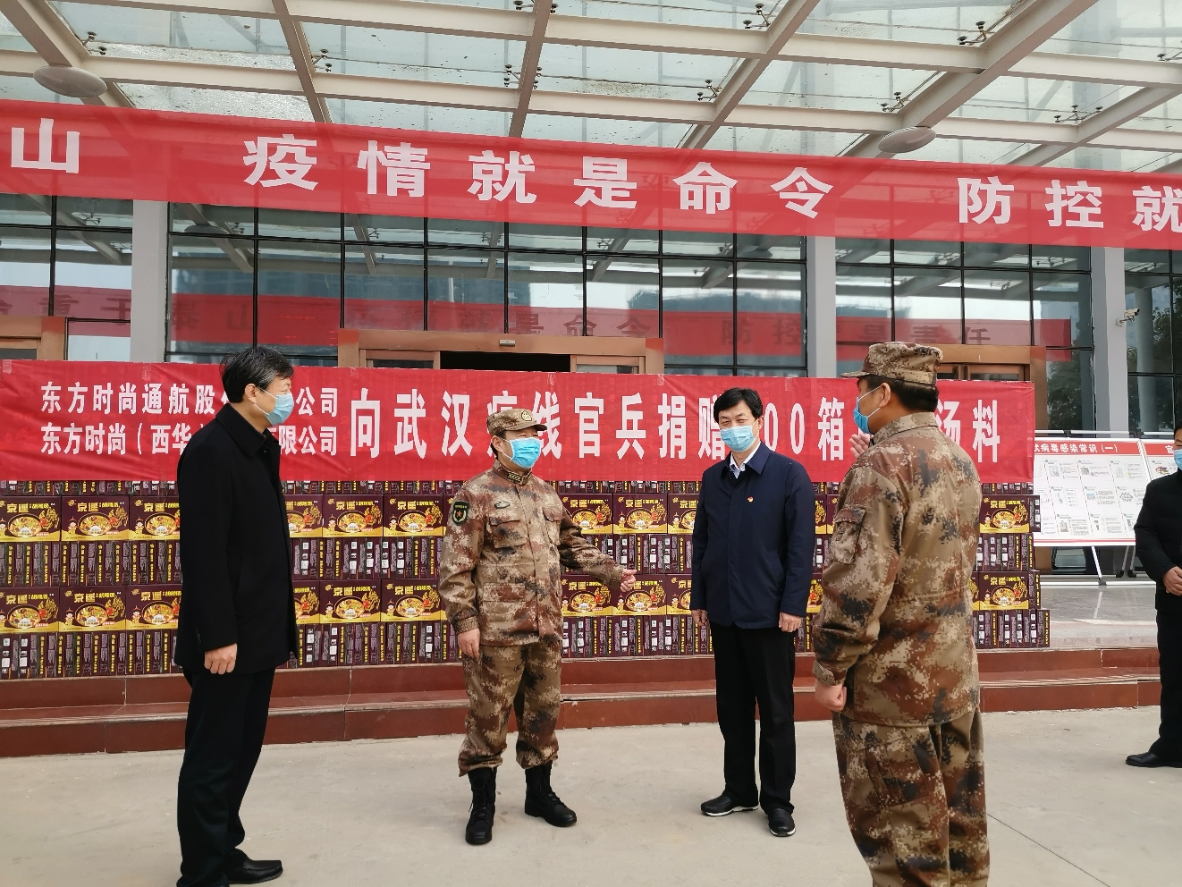 在西華縣人武部院內(nèi),東方時(shí)尚通航股份有限公司向武漢疫線官兵捐獻(xiàn)500件胡辣湯料,表達(dá)了企業(yè)對(duì)人民子弟兵的深情厚誼。王善沖代表部隊(duì)對(duì)企業(yè)慰問(wèn)表示感謝。隨后,王善沖一行人又來(lái)到該縣大富城小區(qū),對(duì)堅(jiān)守一線的工作人員表示慰問(wèn),鼓勵(lì)他們?cè)谝咔榉揽氐年P(guān)鍵時(shí)刻要繼續(xù)堅(jiān)持、不能有放松麻痹思想。