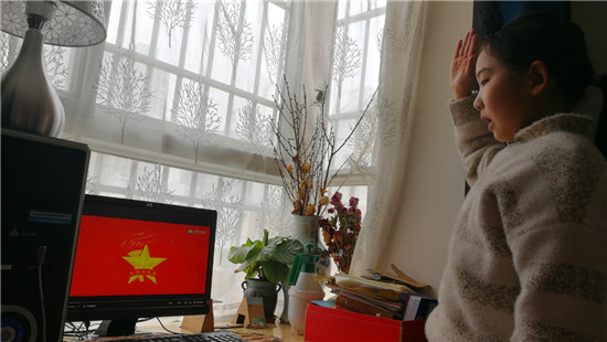 2月25日,周口市文昌小學三(5)班一名學生在家中敬隊禮、唱隊歌。自新冠疫情發(fā)生以來,周口市文昌小學通過網(wǎng)絡(luò)授課方式,使孩子們停課不停學。當日,該校組織學生在網(wǎng)上觀看“河南省少先隊活動抗疫專題示范課”,讓孩子們學到了很多關(guān)于新冠肺炎的相關(guān)知識。