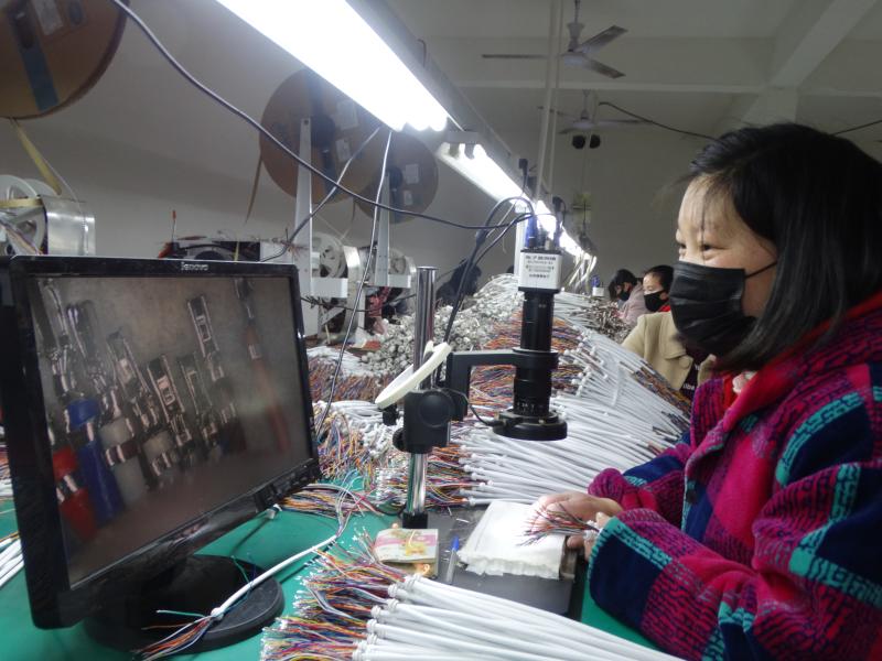近日,沈丘縣周營鎮(zhèn)眾邦電子來料組裝扶貧車間內(nèi),當(dāng)?shù)卮迕裼秒娔X檢驗細(xì)微端子產(chǎn)品質(zhì)量。