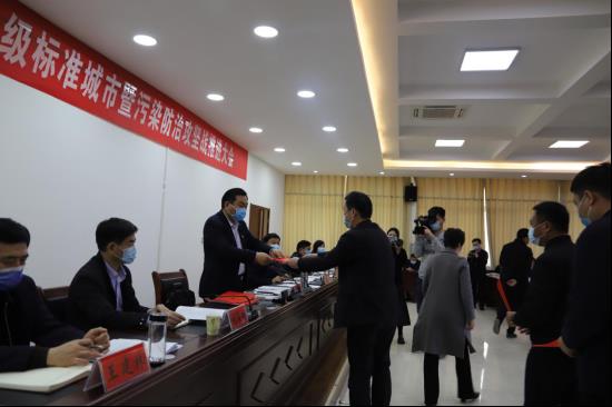 城關鎮(zhèn)、縣城管局、縣市場監(jiān)管局3家單位主要負責人和縣1家城市保潔公司,圍繞創(chuàng)建國家空氣質(zhì)量二級標準城市工作相繼作表態(tài)發(fā)言。各鄉(xiāng)鎮(zhèn)黨委書記分別向縣委書記王國璽遞交創(chuàng)建保證書。
