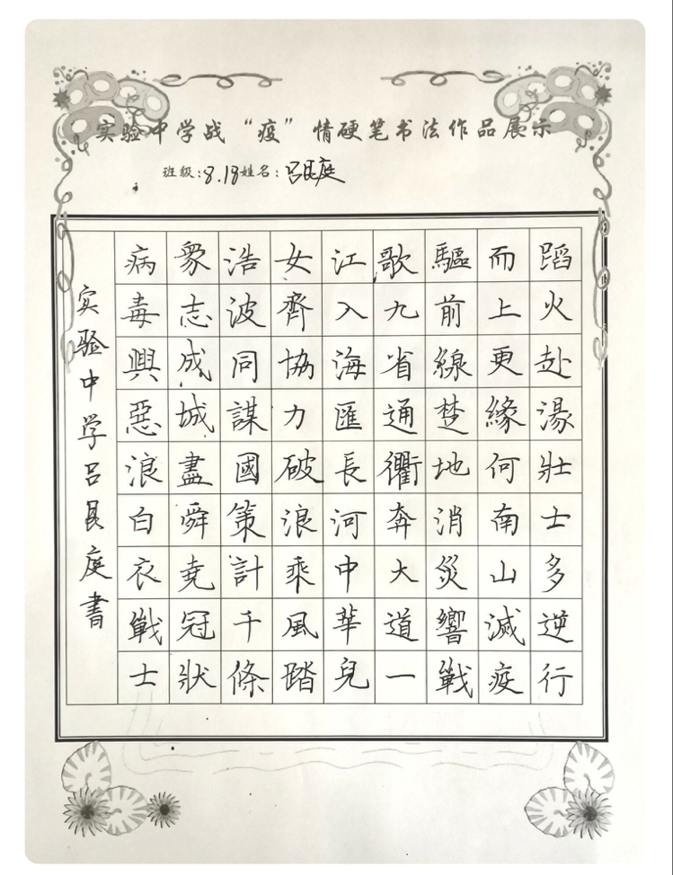 “赴湯蹈火壯士多,逆行而上更緣何。南山滅疫驅(qū)前線,楚地消災(zāi)響戰(zhàn)歌。九省通衢奔大道,一江入海匯長河。中華兒女齊協(xié)力,破浪乘風(fēng)踏浩波......”扶溝縣實(shí)驗(yàn)中學(xué)“萬眾一心 抗擊新冠”硬筆書法比賽中,八(18)班呂艮庭同學(xué)鄭重地抄錄了這首律詩。