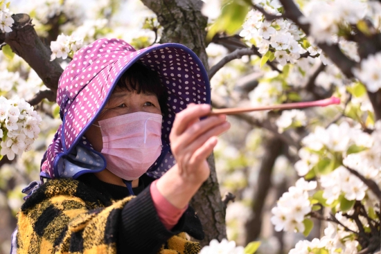 泛區(qū)農(nóng)場(chǎng)的萬(wàn)畝果園不僅吸引著游客觀光游覽,而且盛產(chǎn)的桃、梨、蘋(píng)果,品質(zhì)好,味道好,吸引著商家訂購(gòu),為果農(nóng)帶來(lái)可觀的經(jīng)濟(jì)收入。目前,給梨花授粉是果農(nóng)在花期中最重要的工作,上圖為果農(nóng)正緊張地給梨花授粉。