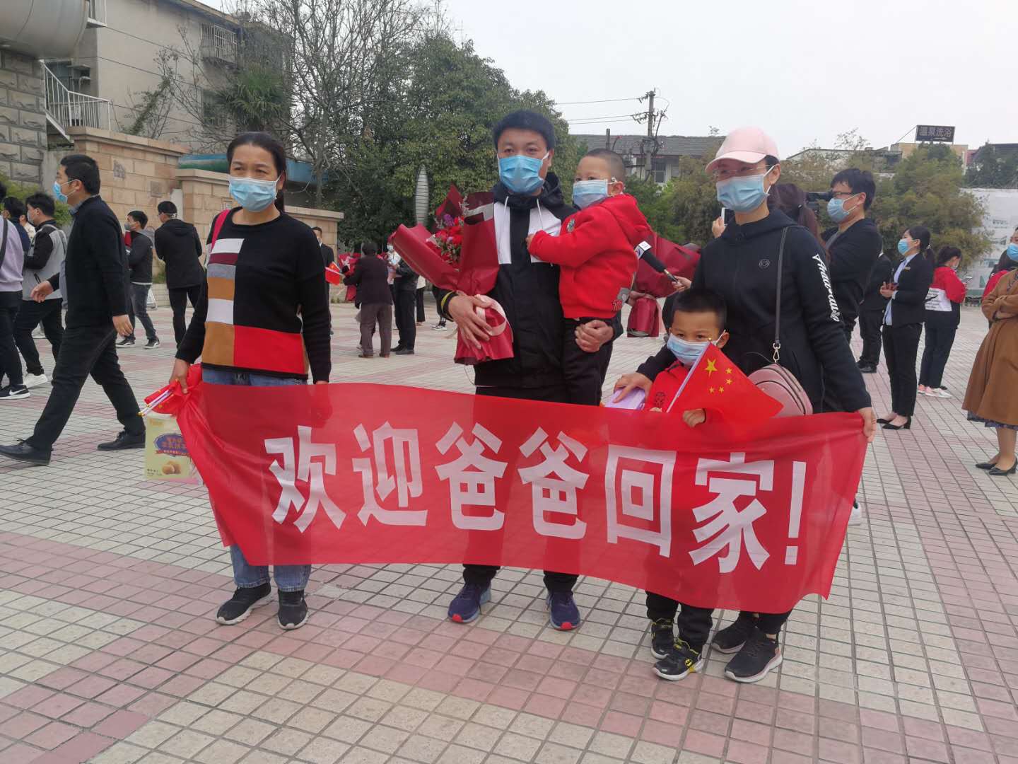 “歡迎爸爸回家”、“歡迎回家” 親人們、同事們、朋友們和自發(fā)趕來的市民早早守候在隔離休整點(diǎn)門口,等著迎接英雄回家。一束束鮮花、一條條橫幅都在向凱旋而來的勇士們表達(dá)著敬意和思念。