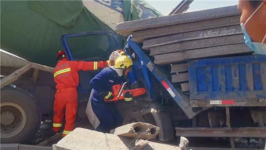 據(jù)了解,由于兩車相撞產(chǎn)生的沖擊力導(dǎo)致貨車與水泥灌車的車體緊緊連在一起,貨車駕駛員被卡在駕駛位上無(wú)法動(dòng)彈。為了能盡快將被困司機(jī)救出來(lái),現(xiàn)場(chǎng)指揮員指揮救援人員協(xié)助現(xiàn)場(chǎng)交警、路政部門立即對(duì)事故路段進(jìn)行封鎖處理,并設(shè)置安全員對(duì)過(guò)往車輛進(jìn)行警示,保證救援工作正常開展。同時(shí),另一組救援人員首先對(duì)壓住駕駛室的石板進(jìn)行清理,然后使用液壓器材工具組進(jìn)行破拆,并對(duì)駕駛員腿部被擠壓部位進(jìn)行擴(kuò)張。經(jīng)過(guò)十五分鐘的緊急救援,被困司機(jī)被成功救出后移交現(xiàn)場(chǎng)救護(hù)車送往醫(yī)院治療。