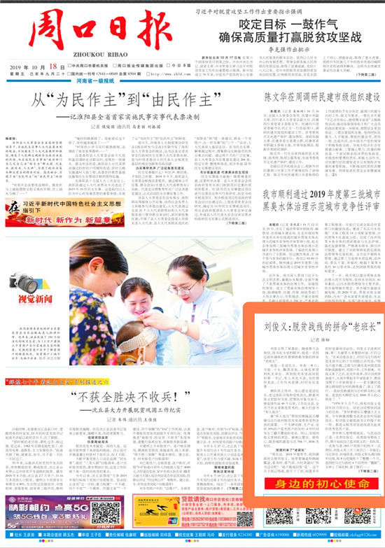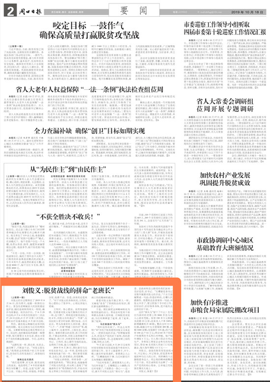 2019年10月18日,《周口日報(bào)》頭版轉(zhuǎn)版,以《劉俊義:脫貧戰(zhàn)線的拼命“老班長”》