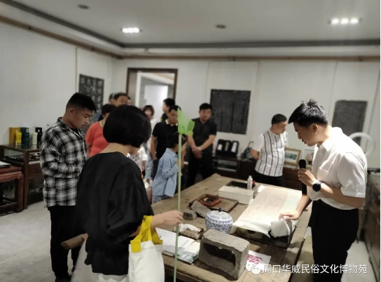 由于當(dāng)天是禮拜六,孩子們和大人來的特別多,陸陸續(xù)續(xù),穿梭不停,其中最大的一個游客團(tuán)由20多人,孩子們牽著大人的手,游百獅園,參觀華威綜合展廳的木質(zhì)榨油機(jī)和書畫,到華威學(xué)堂看拓片技藝,觀看香文化。