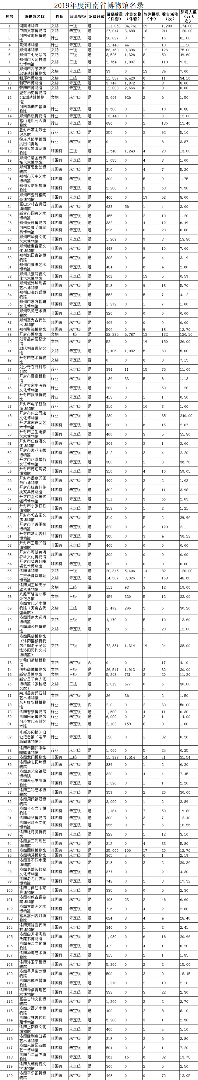《名錄》公開了2019年河南省各家博物館的多個方面的數(shù)據(jù),包括藏品數(shù)量、珍貴文物數(shù)量、陳列展覽、教育活動、參觀人數(shù)等。根據(jù)《名錄》,截至2019年年底,周口市(縣、區(qū))有二級博物館1家,三級博物館2家,未定級博物館15家,收藏文物60144件套,珍貴文物5706件套。