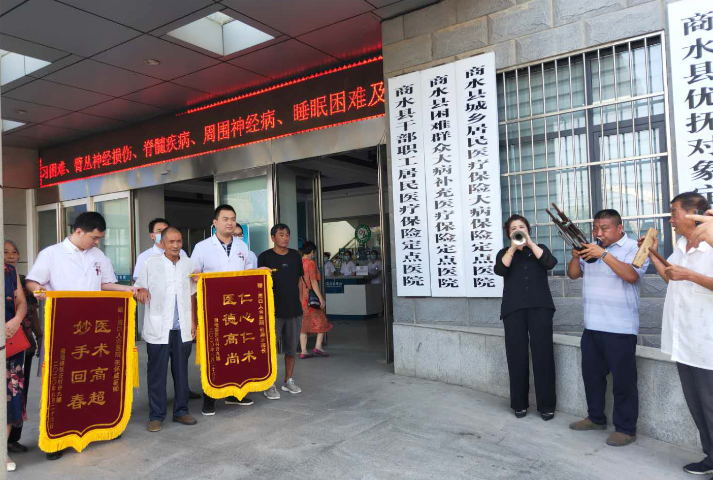“醫(yī)術(shù)醫(yī)風(fēng)醫(yī)德好,俺給好醫(yī)生送錦旗”,歡快高昂的嗩吶聲響徹周口人合醫(yī)院急診部門前,嗩吶手以歡快的音樂表達(dá)著感激的話語,8月27日上午10時,來自商水縣固墻鎮(zhèn)張莊村的許九德老人帶著家人和一班嗩吶手,來到周口人合醫(yī)院送來錦旗,以農(nóng)民最樸實(shí)的方式表達(dá)自己的謝意。