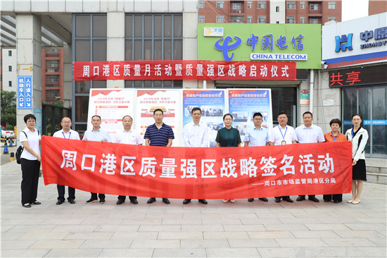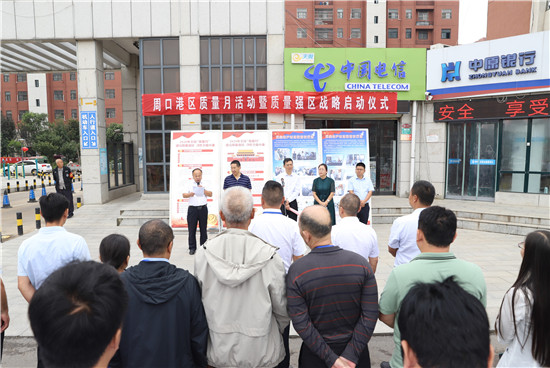 9月21日上午,周口市市場(chǎng)監(jiān)管局港區(qū)分局在轄區(qū)港城小區(qū)舉辦周口港區(qū)質(zhì)量月活動(dòng)暨質(zhì)量強(qiáng)區(qū)戰(zhàn)略啟動(dòng)儀式。周口市市場(chǎng)監(jiān)管局二級(jí)調(diào)研員趙學(xué)軍、港區(qū)管委會(huì)副調(diào)研員李素芹參加儀式并講話。
