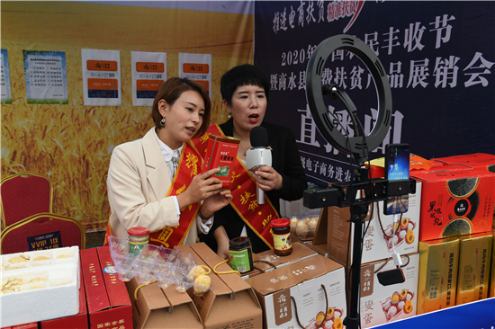 9月22日,兩名“網紅”在商水縣中國農民豐收節(jié)暨商水縣消費扶貧產品展銷會上進行直播銷售。近年來,商水縣大力發(fā)展電商扶貧,出臺政策,幫助農民通過網絡直播等手段把本地的豬蹄、咸鴨蛋、牛肉、變蛋、黑色五谷等特色農產品銷往全國各地,打開農產品銷售新渠道,為農民脫貧致富奔小康增添新動能。