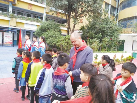 10月13日,是中國少年先鋒隊誕辰日,又稱少先隊建隊紀念日。周口市文昌小學堅持以立德樹人,把課堂教學與主題活動相結合,開展了多種多樣的“國旗下成長”主題教育活動。圖為在10月12日的升旗儀式上,六(4)中隊少先隊員向全校學生普及紅領巾知識。記者 王珂 通訊員 魏云紅 攝