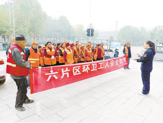為保障環(huán)衛(wèi)工人的安全,項城市城管局每周二定期對環(huán)衛(wèi)工人開展安全教育,提醒環(huán)衛(wèi)工人霧天不上主干道、掃地順車道、過馬路注意信號燈等,增強了環(huán)衛(wèi)工人的安全交通意識。圖為項城市城管局六片區(qū)負責人為環(huán)衛(wèi)工人講解安全知識。