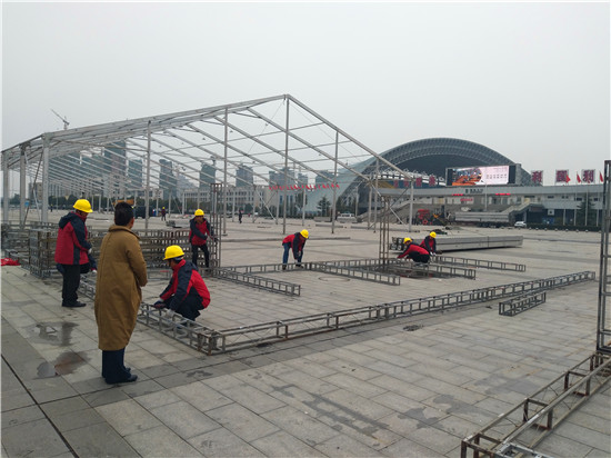 為迎接11月28日至30日舉辦的周商產(chǎn)品展示展覽活動,現(xiàn)場70余名施工人員不顧天氣惡劣,抓緊搶干工期,爭取在11月25日全面搭建完畢。