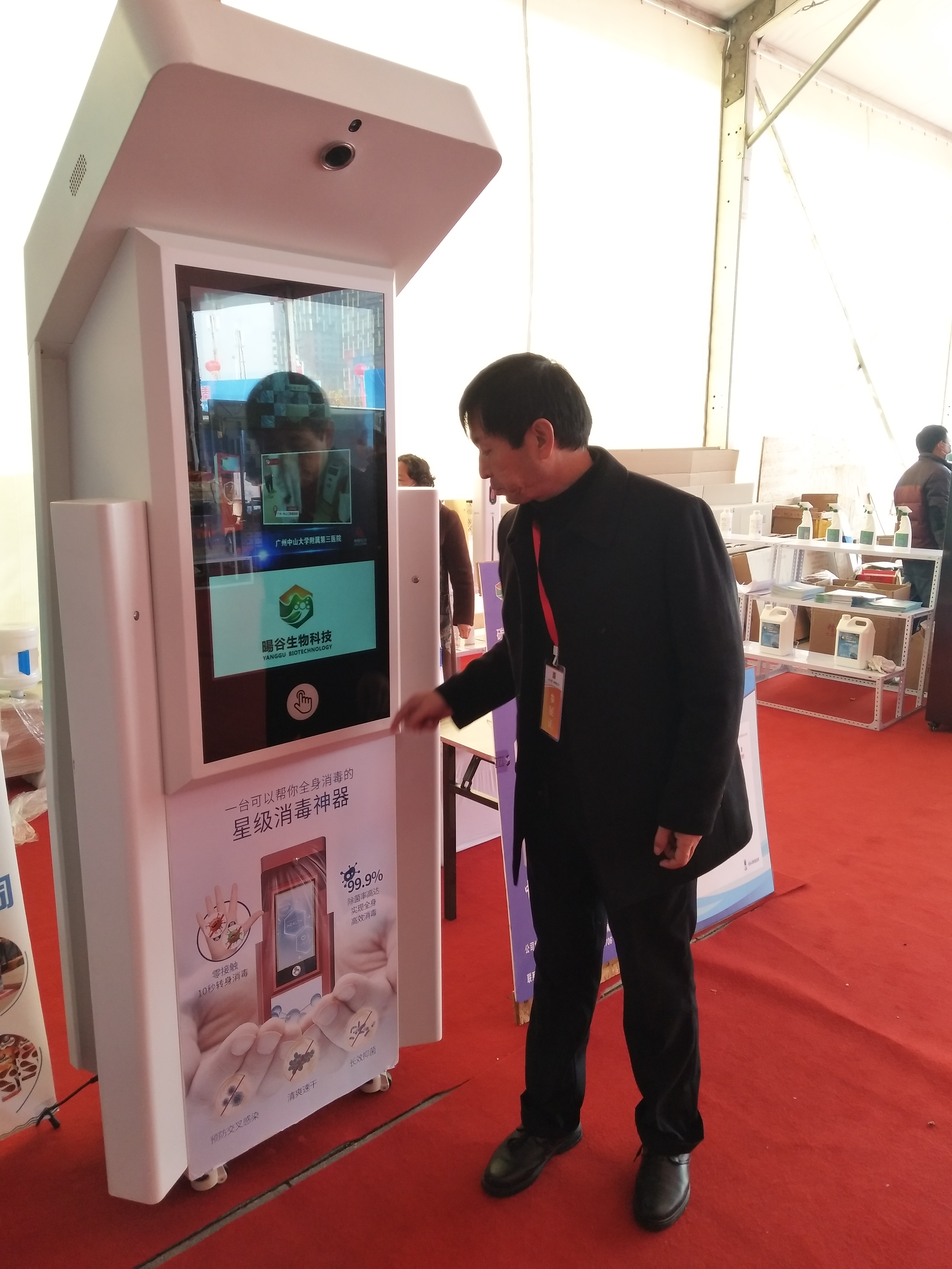 手掌往感控區(qū)上輕輕一罩,液晶屏四角就噴出霧化消毒液,大概持續(xù)10秒,足夠人轉(zhuǎn)一圈做周身消毒——在周商產(chǎn)品展示展覽大廳的西南角,北京陽谷生物科技有限公司市場(chǎng)部總監(jiān) 、項(xiàng)城人張清峰在介紹“人體感應(yīng)消毒機(jī)”,引得市民紛紛圍觀體驗(yàn)。由于消毒液沒有異味,部分市民質(zhì)疑是清水,對(duì)此張清峰說:“我們用的是‘竹芳牌’碳酸型微酸性次氯酸消毒液,我們的消毒機(jī)主要是面向校園推廣的,給孩子用的東西除了要有效,還得保證安全溫和,碳酸型的消毒液就沒有這么大的刺激性。”據(jù)張清峰介紹,“人體感應(yīng)消毒機(jī)”是今年五月下旬生產(chǎn)的新品,目前處在推廣階段,“當(dāng)?shù)弥芸谝k第一屆周商大會(huì)的消息,我第一時(shí)間想到要把消毒機(jī)展示給家鄉(xiāng)父老。我是個(gè)在北京打拼十多年的項(xiàng)城人,目前河南分公司由我負(fù)責(zé),項(xiàng)城市政府給了我很多支持?!?/p>