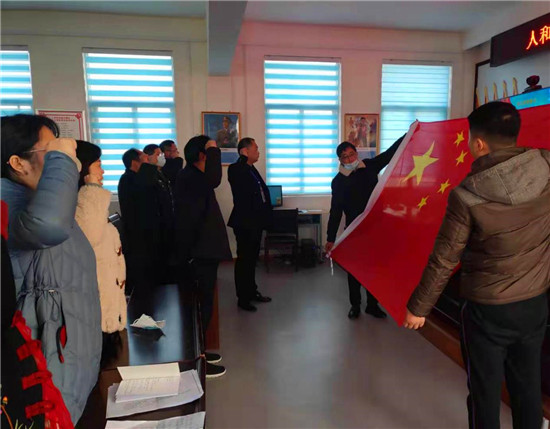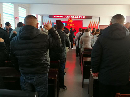 人和街道辦事處人大工委主任韓鈞右手舉拳,領(lǐng)誦誓詞,全體宣誓人肅立,面向國旗莊嚴(yán)宣誓。