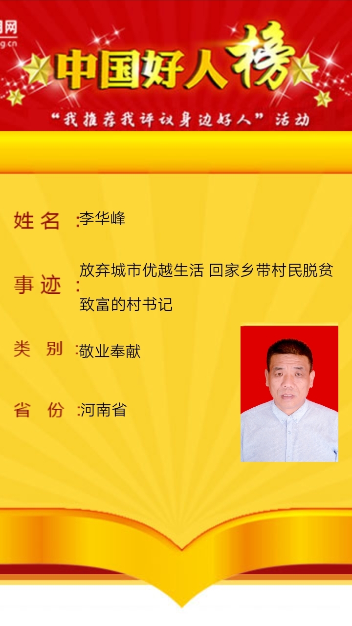昨日,記者從市文明辦獲悉,今年46歲現(xiàn)任太康縣轉(zhuǎn)樓鎮(zhèn)李報(bào)真行政村黨支部書(shū)記的李華峰,放棄城市優(yōu)越生活,回鄉(xiāng)帶領(lǐng)村民致富,榮登2020年10月份“敬業(yè)奉獻(xiàn)”類(lèi)“中國(guó)好人榜”。至此太康縣中國(guó)好人達(dá)到67人。