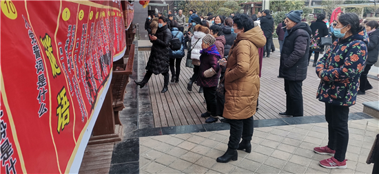 一大早,來自川匯區(qū)文聯(lián)、區(qū)民協(xié)的工作人員,將金色東方社區(qū)的休閑廣場(chǎng)裝扮得格外喜慶,兩條帶有傳統(tǒng)紋飾圖案的噴繪印著謎語和黨的知識(shí),掛在休閑長(zhǎng)廊上,吸引著出來曬太陽或散步的居民。區(qū)文聯(lián)黨組書記史濤,區(qū)文聯(lián)黨組成員、副主席游富華,區(qū)人和辦事處副書記武陽,市民協(xié)副主席羅營(yíng)東、區(qū)民協(xié)主席杜超,區(qū)民協(xié)秘書長(zhǎng)任建明等走進(jìn)社區(qū),參加這場(chǎng)活動(dòng)。“中國共產(chǎn)黨是什么時(shí)候成立的?”“1921年7月23日”“答對(duì)了,獎(jiǎng)洗衣液一壺!”游富華以問答的形式和居民們互動(dòng),向居民們普及黨的知識(shí),居民們紛紛參與,氣氛活躍。