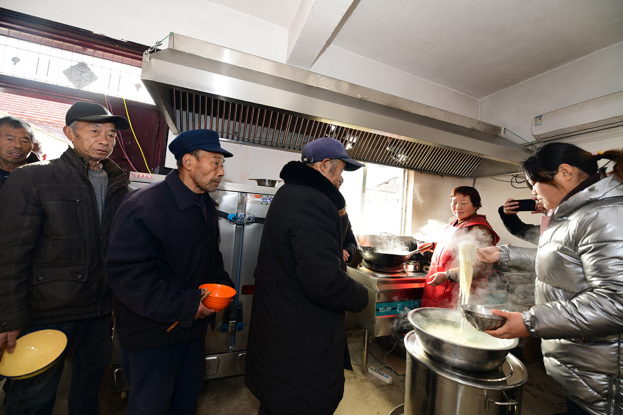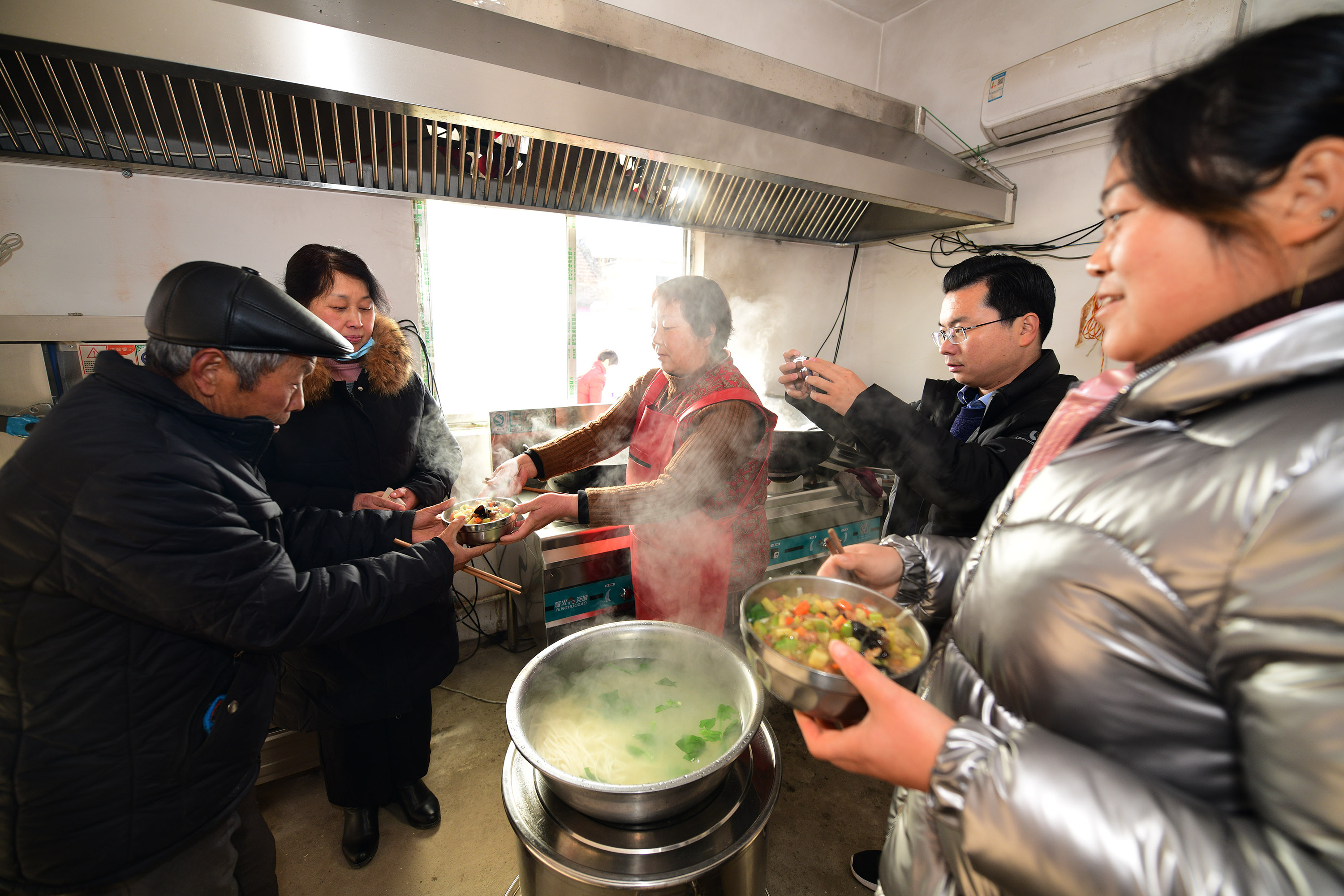 兩個月前,經過籌備,七里倉二村的村食堂建成,大鍋飯開伙。食堂設在一家去世的五保戶家里。村里將房子內外粉刷一遍,還買來了廚具、桌椅。做大鍋飯的是村里的兩名留守婦女。記者于12月15日中午趕來時,村食堂正開飯,老人們憑票打飯,午飯是臊子面。老人每人端一碗,來到飯廳就餐。這里有村里裝的電視,大家邊聊天邊吃飯邊看電視,其樂融融。