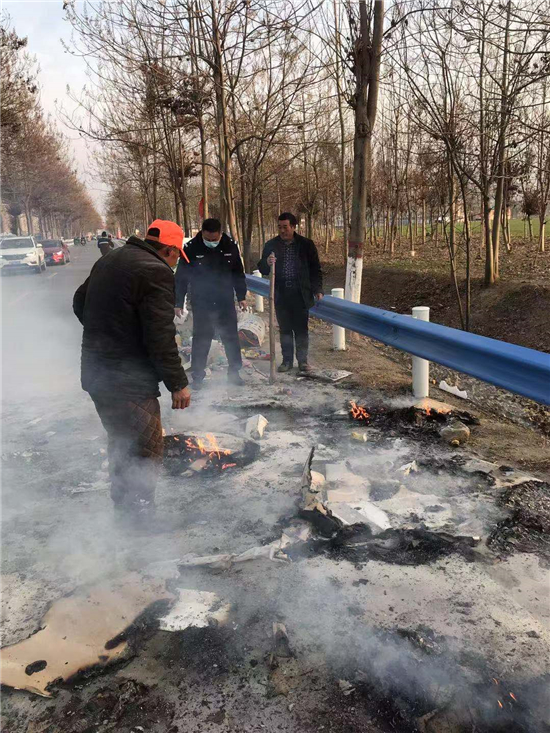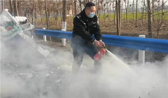 當(dāng)日下午4點(diǎn)左右,太康縣交警大隊(duì)二中隊(duì)指導(dǎo)員南應(yīng)開及輔警郭旗全、魯?shù)?、尹晨豪正在趙堂村附近巡邏時(shí),猛然看到前方一輛電動三輪車上有煙氣冒出,巡邏民警加速趕到。原來是一名老漢的一輛拉著廢舊紙箱的電動三輪車著了火,一車廢紙和塑料瓶散落一地正在燃燒,火越燒越旺,只見老漢正在手忙腳亂地滅火。這輛三輪車上拉的全是廢塑料、硬紙殼等易燃物,而且當(dāng)時(shí)正刮著風(fēng),如果不及時(shí)滅火任由火勢蔓延,后果將不堪設(shè)想??吹酱饲闆r后,南應(yīng)開迅速從警車上拿出滅火器秒變“消防員”,對著起火的物品進(jìn)行滅火操作,同時(shí)安排輔警對過往行人和車輛進(jìn)行疏導(dǎo)。由于發(fā)現(xiàn)和撲救及時(shí),在民警的緊急救援下,火源很快被眾人合力撲滅。對太康交警面對火情臨危不亂、果斷處置、幫助群眾的行為,老漢車主和過往群眾紛紛點(diǎn)贊。②6