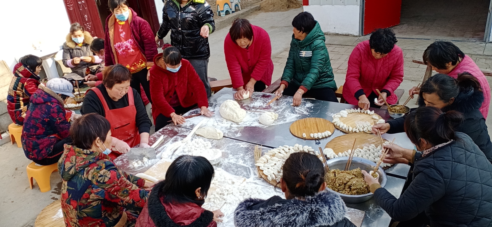 鄉(xiāng)村大食堂院子里,大家有說(shuō)有笑,圍在數(shù)平方米的巨大案板前,個(gè)個(gè)拿出了看家本領(lǐng),分工協(xié)作,揉面、搟皮、包餃子,個(gè)個(gè)動(dòng)作嫻熟,包起餃子來(lái)麻利干練,不知不覺間,面前的盤子里就擺滿了餃子。