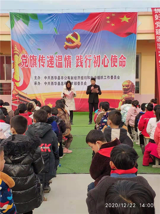 12月22日,西華縣“兩新”組織黨工委聯(lián)合縣總商會(huì)黨支部,在艾崗鄉(xiāng)潘南小學(xué)開展“黨旗傳遞溫情、踐行初心使命”愛心捐助活動(dòng),潘南小學(xué)全體師生及愛心企業(yè)家共計(jì)200余人參加活動(dòng)。