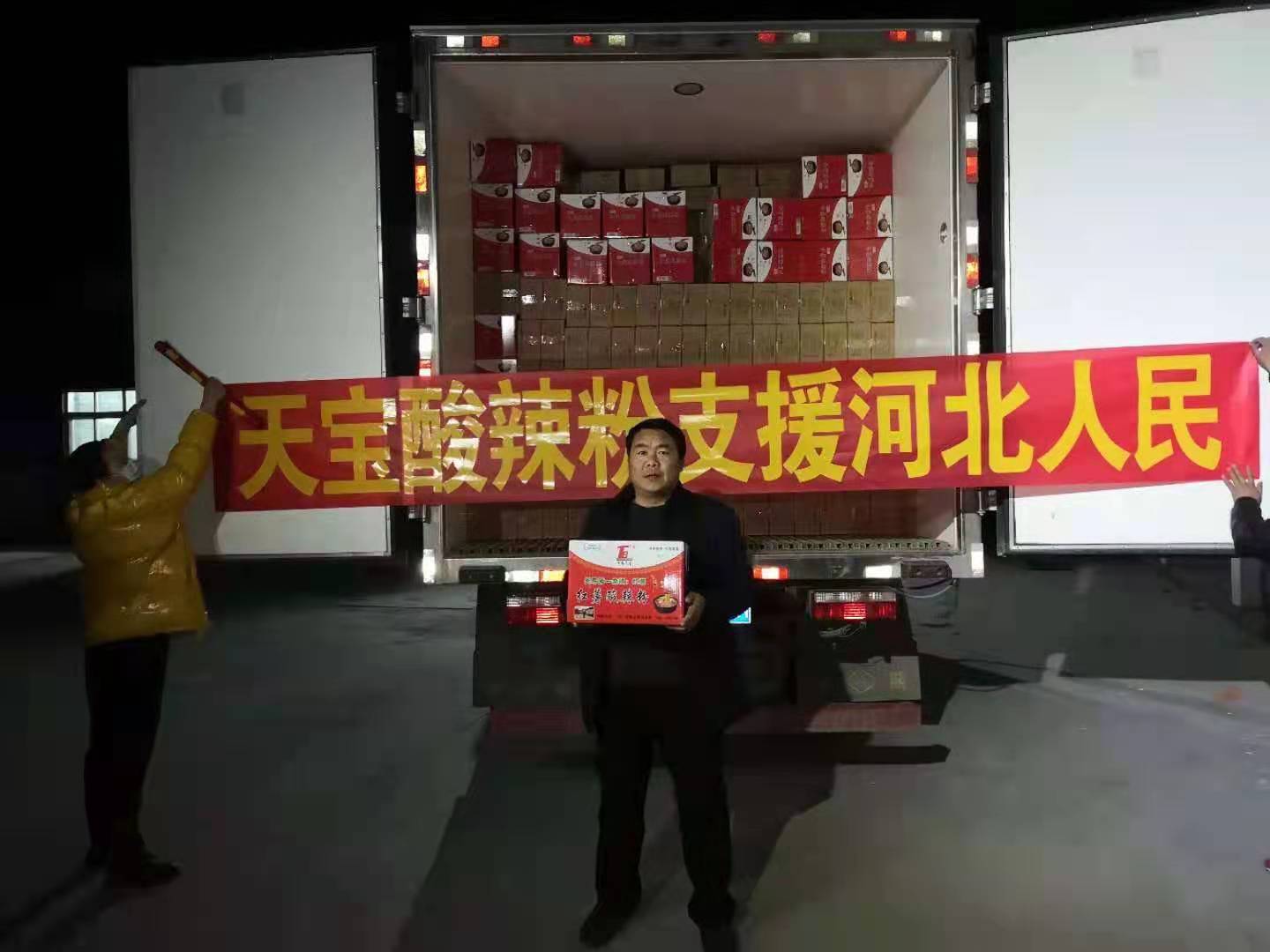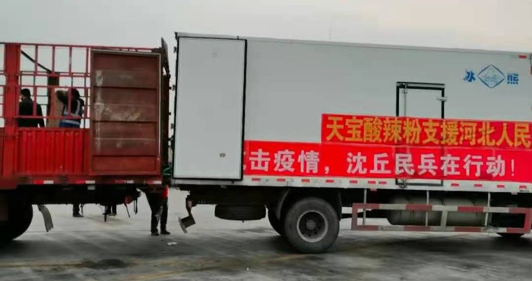 于是,他當(dāng)即與河北省南宮市相關(guān)防疫部門(mén)取得聯(lián)系,天宮那邊欣然接受,并表示感謝。1月20日當(dāng)夜,便組織召集村上的“鐵桿工人”連夜加班加點(diǎn)生產(chǎn)了價(jià)值5萬(wàn)元共計(jì)1萬(wàn)盒“天寶酸辣粉”,無(wú)償捐贈(zèng)給河北天宮市,送去來(lái)自沈丘縣中豫天寶食品有限公司的一片愛(ài)心。