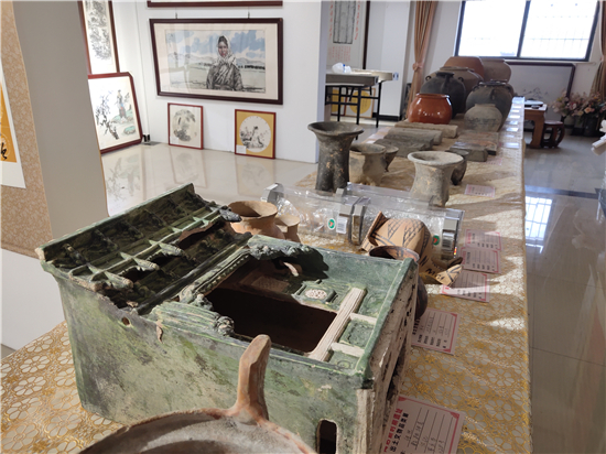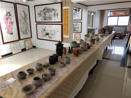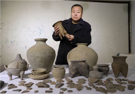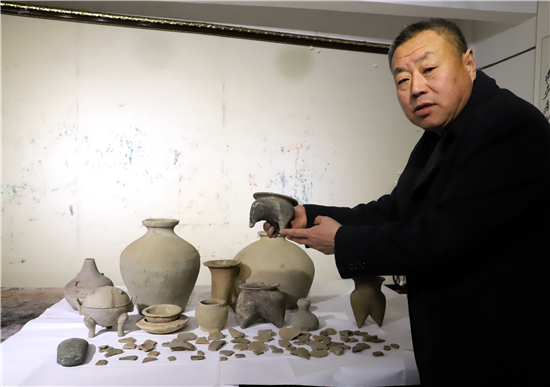 三足燉肉的陶鬲、圓形擦粉的粉盒、前方后圓的灶臺(tái)、帶孔過(guò)濾的茶罐、廣口大肚的糧罐、象形浮雕的方磚、雙耳大肚的水壺……1月31日,鄲城縣文聯(lián)副主席、收藏家協(xié)會(huì)會(huì)長(zhǎng)閆振宇打開自己的“博物館”,將多年來(lái)在鄲城縣丁村鄉(xiāng)陶店村出土并收藏的數(shù)十件陶器向記者展示,以此進(jìn)一步證明陶店遺址是龍山文化新時(shí)期石器遺址,疑為中國(guó)灰陶最早生產(chǎn)地,中國(guó)陶器之鄉(xiāng)。