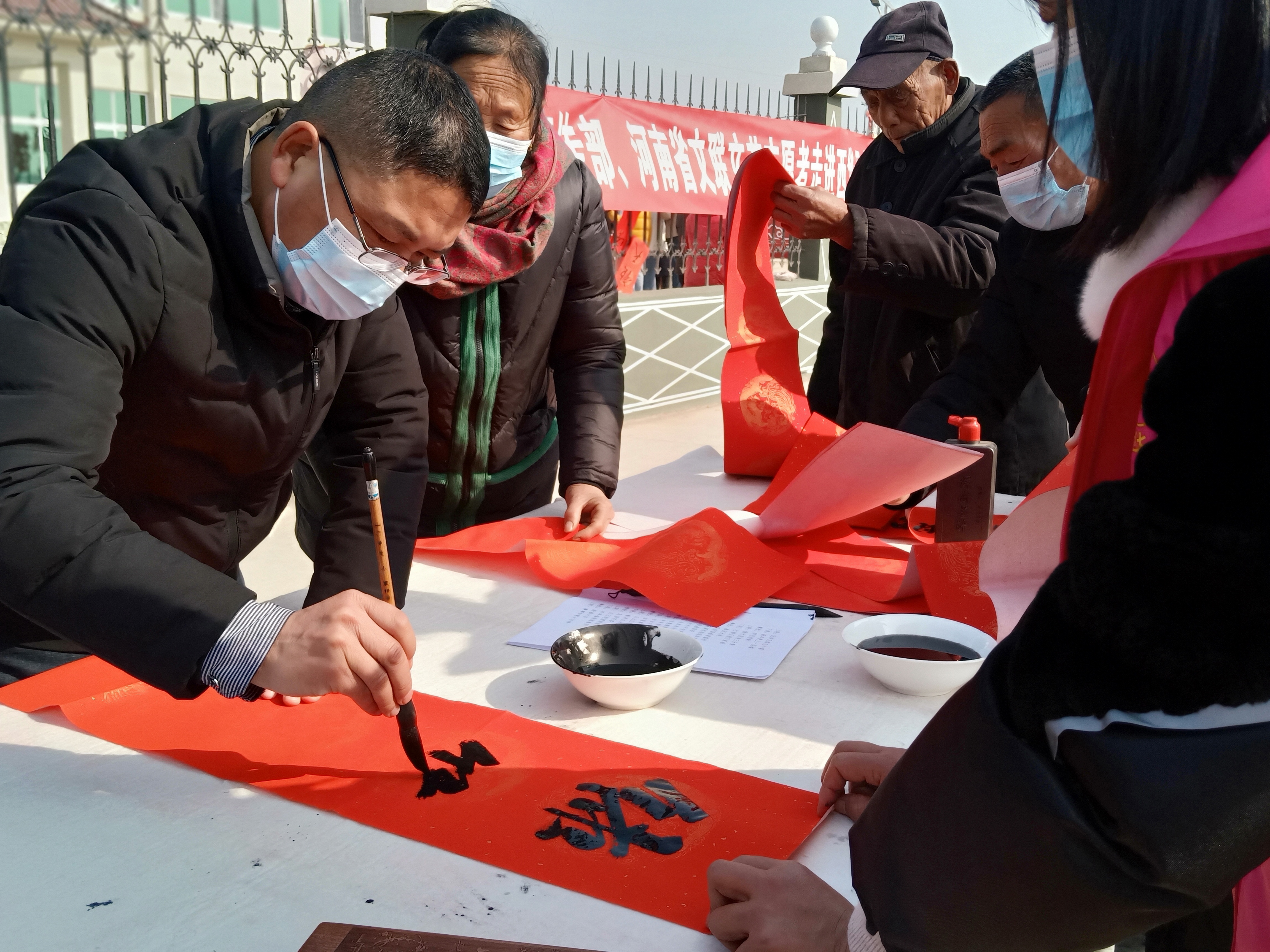 一大早,半截樓村新時代黨群服務中心樓前大院里人頭攢動、歡聲笑語、翰墨飄香。一邊是省文聯(lián)志愿者義寫春聯(lián)送福,一邊是文藝志愿者文藝培訓。村民們喜領一副副散發(fā)著墨香的大紅春聯(lián),臉上洋溢著幸福喜悅的笑容。