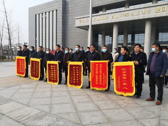2月4日下午,淮陽區(qū)康森木業(yè)有限公司、周口裕彩科技研發(fā)有限公司等6家企業(yè)代表為區(qū)優(yōu)化營商環(huán)境專項治理工作組送來了6面錦旗和大量防疫物資,向工作組表達(dá)感激之情,對工作組人員高效快捷的工作給予高度贊揚(yáng)。