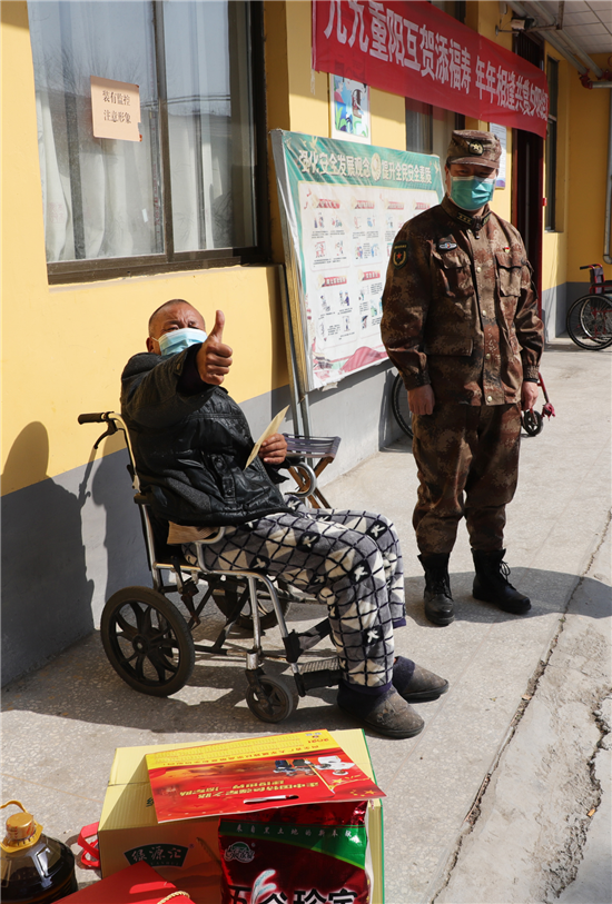 新橋鎮(zhèn)新兵楊凱入伍前和癱瘓的父親相依為命,市人武部領(lǐng)導(dǎo)協(xié)調(diào)地方政府,把其父親送到了新橋鎮(zhèn)敬老院公費(fèi)養(yǎng)老,解除他的后顧之憂。春節(jié)到了,人武部領(lǐng)導(dǎo)還牽掛著這個(gè)特困家庭,矯百成帶隊(duì)來到新橋鎮(zhèn)敬老院。此時(shí)正值中午,楊凱的父親正坐在屋外的輪椅上曬太陽,見到矯部長(zhǎng)的突然到來,激動(dòng)的眼含熱淚,他緊緊握住矯百成的手久久不愿松開。矯百成噓寒問暖,給他送上1000元慰問金和生活必需品,楊凱的父親用他那不太清晰的語言表達(dá)對(duì)部長(zhǎng)的真誠感謝。在敬老院院長(zhǎng)的帶領(lǐng)下,矯百成又來到老人的住室察看起居情況,詢問他平時(shí)生活狀況,當(dāng)?shù)弥先松畹暮苁娣r(shí),矯百成滿意的笑了。