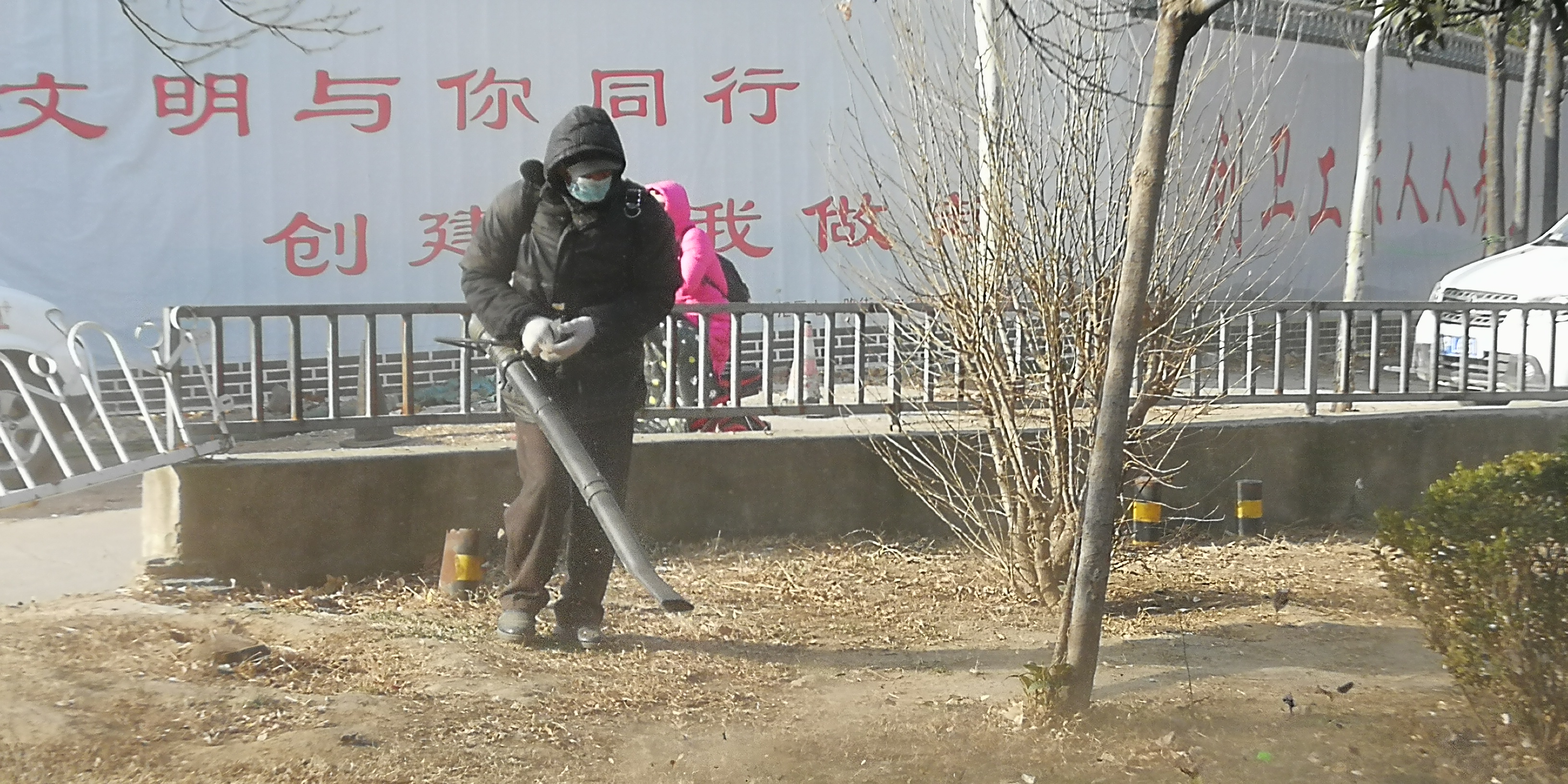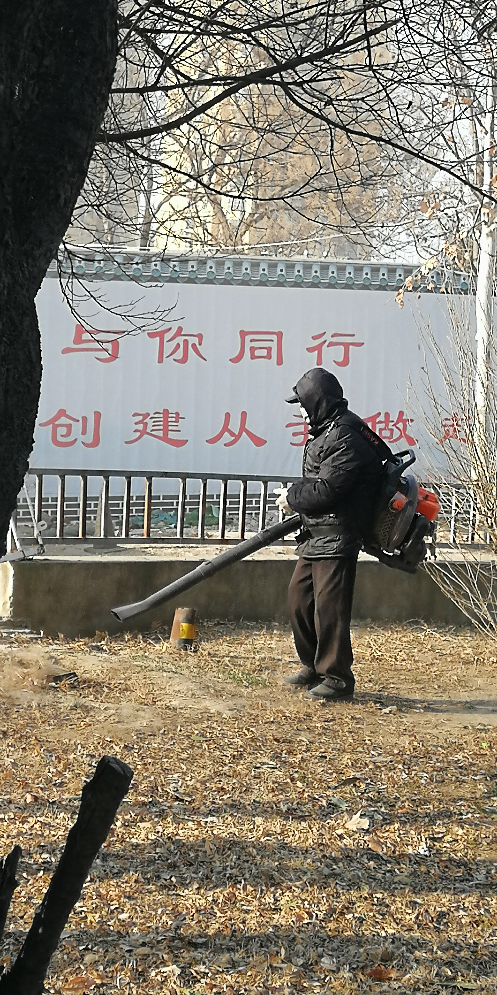 2月11日,大年三十。在川匯區(qū)濱河路上,工作人員背著吹風(fēng)機(jī)清理游園內(nèi)的落葉和垃圾。工作人員介紹,這樣便于更快更好地工作。(周口日報(bào)·周道客戶端記者 馬月紅)②7