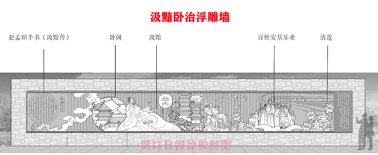 在縣委、縣政府綜合大樓東側(cè)的核心形象段,配合鄲城行政中心打造莊嚴、大氣氛圍的同時,對鄲城歷史文化進行了集中展示,包括鄲城的歷史沿革,鄲城的發(fā)展理念,歷史故事等。其中調(diào)水渠西側(cè)以現(xiàn)有人民廣場對應(yīng)的綠地為基礎(chǔ),設(shè)置了較多的歷史文化節(jié)點。如調(diào)水渠新華路橋頭北側(cè)的廉政文化廣場,講述了漢朝名臣汲黯的故事。汲黯為人耿直,直諫廷諍,親政愛民,敢于承擔(dān)責(zé)任,漢武帝劉徹稱其為“社稷之臣”。汲黯廉政廣場建設(shè)在此處更有著深遠的意義,它一方面提醒老百姓要了解歷史、敬畏先賢,同時也激勵著鄲城縣的各級黨員干部要在習(xí)近平新時代中國特色社會主義思想引領(lǐng)下,“不忘初心、牢記使命、廉潔奉公、一心為民”。