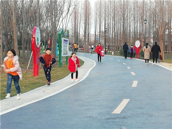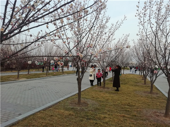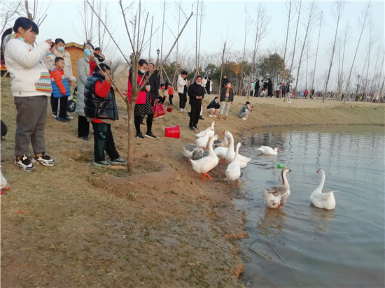 春節(jié)期間,陽光燦爛,眾多市民呼朋引伴選擇近郊游。新落成的淮陽梅園每天迎來成群結(jié)隊的市民。這里臘梅等花樹次第開放,湖水澄清,大白鵝引頸高歌,還有精致的木質(zhì)棧橋等,一步一景,成為人們休閑游玩的好去處。記者 侯俊豫 攝