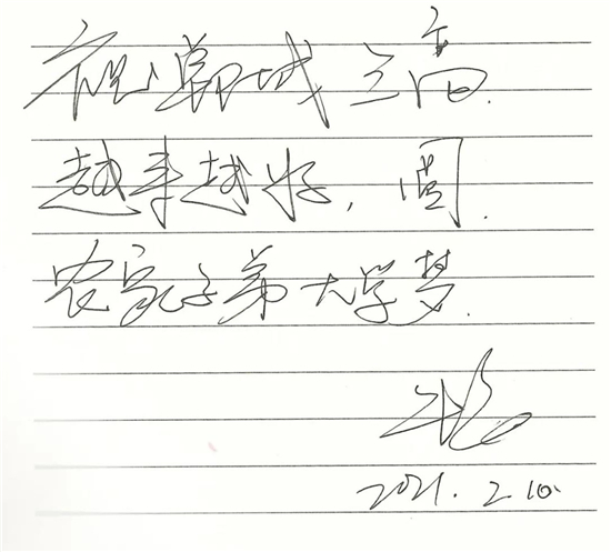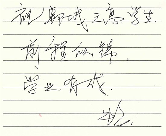 朱婷雖然很少回家,但是一直關(guān)注老家鄲城的發(fā)展變化,特別關(guān)注鄲城的教育發(fā)展,當(dāng)她得知鄲城三高率先提煉出“孝、勤、韌、忠、濟(jì)”為核心的朱婷精神,并把這種精神作為鄲城三高學(xué)子的精神引領(lǐng)時(shí)非常感動(dòng),為鄲城三高始終堅(jiān)持立德樹人的教育理念而高興,為鄲城三高學(xué)子的拼搏進(jìn)取精神而欣慰,為鄲城三高辦學(xué)成果而點(diǎn)贊,并欣然寫下:“ 祝鄲城三高越來(lái)越好,圓農(nóng)家子弟大學(xué)夢(mèng);祝鄲城三高學(xué)生前程似錦,學(xué)業(yè)有成。”