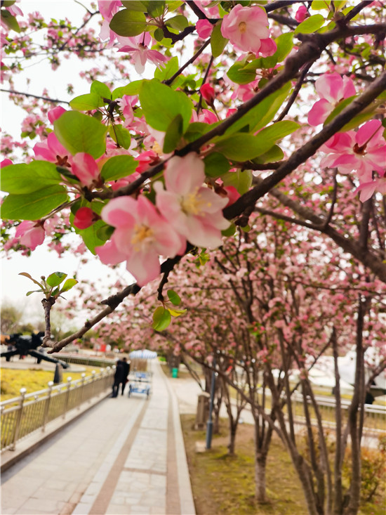 公園里的海棠花繼紫葉李花后,已經進入盛花期,最集中的地方在公園西門附近,一條美麗的海棠花小道正在靜待四方來客。樹上已經開滿粉紅色的小花,潔白的花瓣、微紅的花蕊。目前有不少市民來此觀賞。