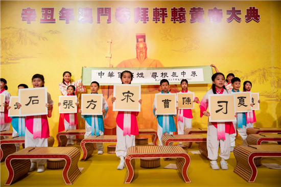在儀程“高唱頌歌”環(huán)節(jié),30名澳門小學(xué)生身穿漢服,邊唱《黃帝頌》邊在小書桌上書寫毛筆字。隨后,孩子們舉起書寫的姓氏,后排兩名身穿漢服的老師打開“中華百家姓”卷軸,引來參加拜祖活動的來賓陣陣掌聲。今年拜祖活動現(xiàn)場組織了一個百人的漢服方陣,順應(yīng)流行的“國潮風(fēng)”,成為拜祖活動的又一個亮點(diǎn)。