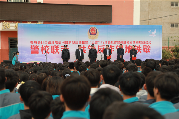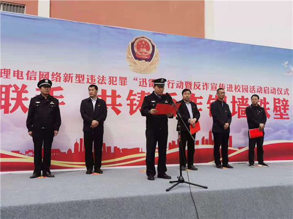 4月18日上午,鄲城縣打擊治理電信網(wǎng)絡(luò)新型違法犯罪“迅雷”行動(dòng)暨反詐宣傳進(jìn)校園活動(dòng)儀式在縣三高啟動(dòng)??h政府副縣長(zhǎng)、公安局長(zhǎng)陳鳳祥,縣政府辦公室主任賈培民,縣教體局黨組書記、局長(zhǎng)羅明黨等出席啟動(dòng)儀式,縣打擊治理電信網(wǎng)絡(luò)新型違法犯罪工作各成員單位、縣公安局、縣三高分別組成代表隊(duì)2200余人參加啟動(dòng)儀式,儀式由賈培民主持。