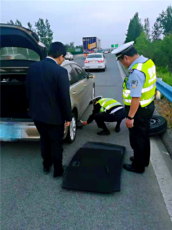 5月2日19時許,市公安局交通管理支隊高速二大隊項城中隊(以下簡稱高速二大隊項城中隊)民警由北往南方向巡邏途中,行駛到2081公里附近西半幅處,發(fā)現(xiàn)一輛轎車因車后輪爆胎,被迫停在應(yīng)急車道,民警隨即幫助該車主更換車載備胎,解決了司機的燃眉之急。