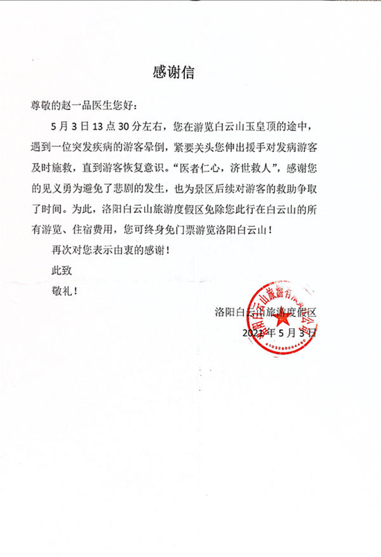 得知趙醫(yī)生見義勇為的事跡后,洛陽白云山旅游度假區(qū)對趙一品醫(yī)生送出了感謝信,免除他此行在白云山的所有游覽、住宿費(fèi)用,并可終身免門票游覽洛陽白云山。