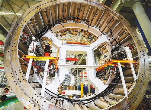 鄭州市經(jīng)開區(qū)中鐵工程裝備集團(tuán)有限公司生產(chǎn)車間,工人在加緊生產(chǎn)。2009年在鄭州成立的中鐵裝備,目前已是中國(guó)最大的隧道掘進(jìn)機(jī)制造服務(wù)商。 聶冬晗攝(中經(jīng)視覺)