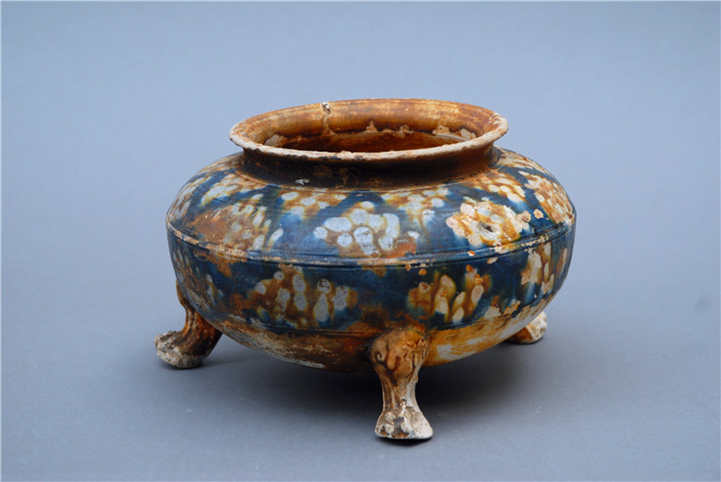 1998年10月,沉睡許久的唐藍釉三彩爐迎來了它的今世。周口市農(nóng)村信用社在建工地上,發(fā)現(xiàn)了一座唐代墓葬。在其中沉睡的唐藍釉三彩爐被吵醒,來到了它的新家——周口市博物館。它敞口,圓唇,短立徑,弧肩,鼓腹,下有三獸蹄足支撐它站立,樣貌圓潤飽滿,與唐代藝術(shù)豐滿、健美、闊碩的特征是一致的。唐藍釉三彩爐不僅體現(xiàn)了唐代人的制陶工藝和智慧,更是絲綢之路與中西文化和物資交流融合的見證,渾身散發(fā)歷史與藝術(shù)的魅力。