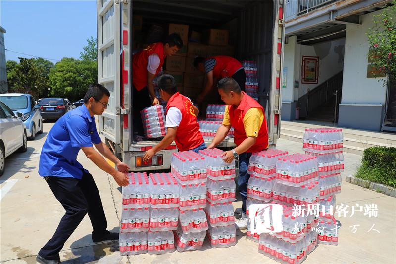 當(dāng)天中午,掛著印有“昨天大家助我脫貧,今天我為救災(zāi)出力!”條幅的防汛救災(zāi)物資運(yùn)輸車抵達(dá)周口港區(qū)?!耙皇乔皟商旆烙_(tái)風(fēng)‘煙花’,我們?cè)缇蛠?lái)了?!甭」糯妩h支部書記段長(zhǎng)春一下車就連忙慰問(wèn)眾人。一同前往的還有6位年輕力壯的志愿者,他們不辭勞苦,和港區(qū)消防、城管人員一起頂著烈日,用了半個(gè)多小時(shí)將滿車物資搬運(yùn)到位。