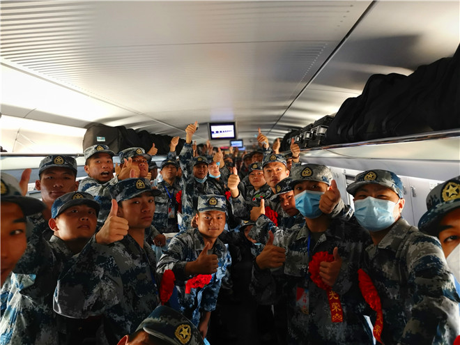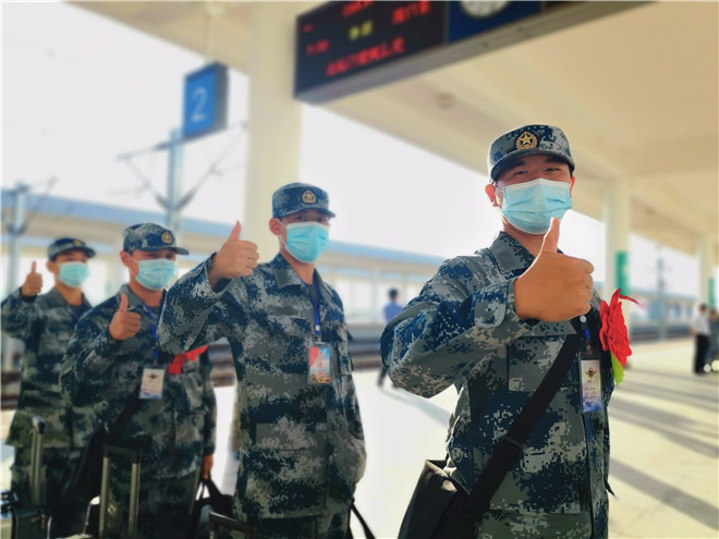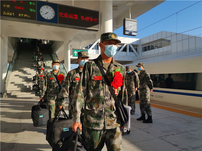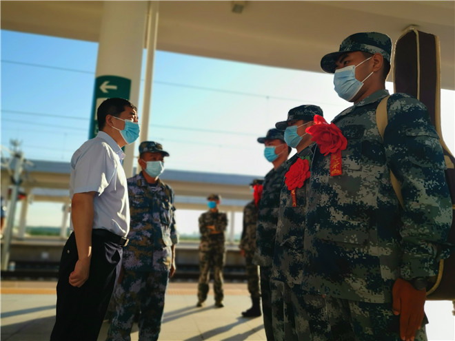 披紅綬帶,胸佩光榮花。候車大廳內(nèi),經(jīng)過役前訓(xùn)練的新兵們已經(jīng)有了“兵樣子”,站姿挺拔,整齊列隊(duì),戎裝待發(fā)。根據(jù)疫情防控要求,不再集中舉行送行送兵,新兵們將分批次從周口出發(fā),開啟他們的軍旅新征程。湯維政、張?jiān)鲗?duì)入伍新兵表示祝賀,對(duì)他們積極響應(yīng)祖國召喚,踴躍報(bào)名參軍,以實(shí)際行動(dòng)依法履行服兵役義務(wù)表示贊揚(yáng)。同時(shí)希望他們到部隊(duì)后,迅速投入新的生活,時(shí)刻嚴(yán)格要求自己,珍惜青春、安心服役,加強(qiáng)學(xué)習(xí)鍛煉,爭當(dāng)周口好兵,嚴(yán)守部隊(duì)紀(jì)律,苦練過硬本領(lǐng),努力把自己鍛煉成有靈魂、有本事、有血性、有品德的新一代革命軍人。