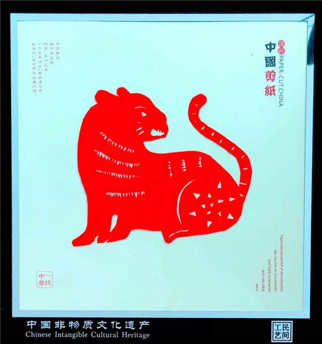 為了慶?;⒛辏醮好穭?chuàng)作的秸稈畫主要有《威震九霄》《虎之王者》《飛天神虎》等,此外,她還創(chuàng)作了兩幅剪紙作品,分別是《虎年組圖》和《虎之2022》。和剪紙作品相比,秸稈畫制作工序更加復雜,全憑手工完成,充分利用秸稈本身的紋理和質(zhì)地,結合顏色、溫度的變化,將畫面立體的呈現(xiàn)出來。其中,她創(chuàng)作的部分作品結合了唐卡的相關風格和顏色配比,比如《威震九霄》中虎的形象所表現(xiàn)出來的力量感借鑒了唐卡中護法的力量感;《虎之王者》和《虎之2022》中對于藍色的運用結合了唐卡中的藍色,代表了永恒不變,如同穹蒼攬護萬物之意。
