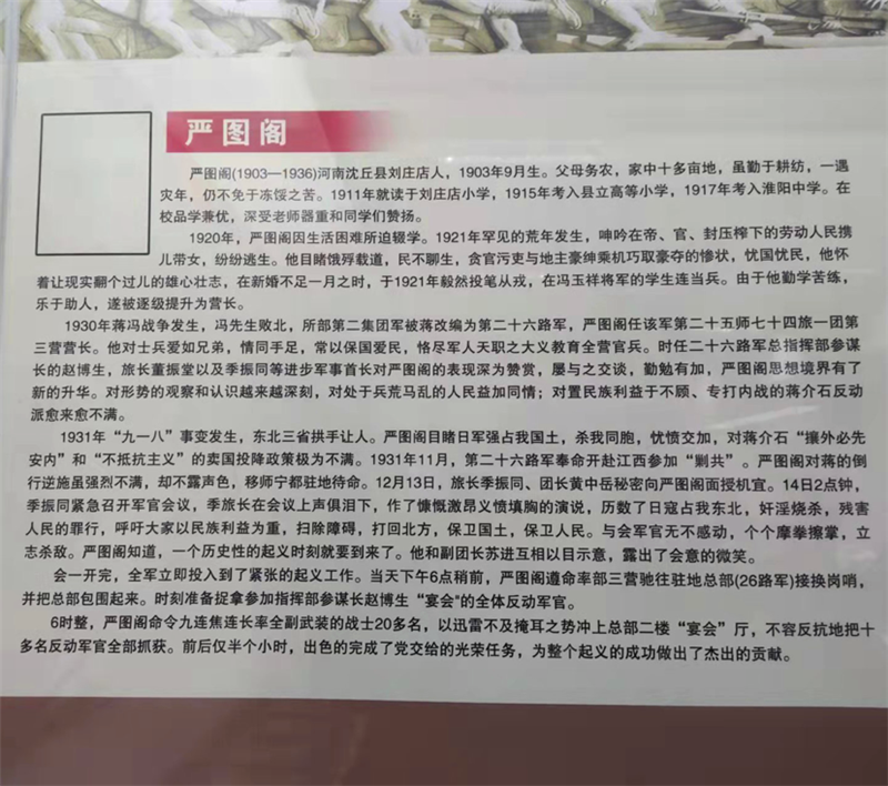 嚴(yán)圖閣出生于1903年,河南省沈丘縣人。1911年,嚴(yán)圖閣被父親送進(jìn)劉莊店小學(xué)讀書,1915年考入縣立高等小學(xué),1917年投考淮陽中學(xué)被錄取。他刻苦讀書,成績優(yōu)異,深得老師和同學(xué)們的贊揚。1921年,他毅然背井離鄉(xiāng),外出從軍。1930年,嚴(yán)圖閣任國民革命軍第二十六路軍一團(tuán)三營營長。1931年12月,參加著名的寧都起義,成為中國共產(chǎn)黨領(lǐng)導(dǎo)的革命隊伍中的一員。寧都起義后,嚴(yán)圖閣所在部隊改編為紅軍第五軍團(tuán),由于其驍勇善戰(zhàn),累積戰(zhàn)功,被任命為第十六師參謀長。1932年,嚴(yán)圖閣正式加入中國共產(chǎn)黨。1935年在湖北一場戰(zhàn)斗中身負(fù)重傷,后轉(zhuǎn)移至湖南省平江縣治療。1936年3月,嚴(yán)圖閣奉命擔(dān)任湘鄂贛省軍區(qū)司令員職務(wù),進(jìn)行游擊戰(zhàn)爭,為保衛(wèi)湘鄂贛革命根據(jù)地作出了貢獻(xiàn)。1936年11月,嚴(yán)圖閣因病不幸去世。