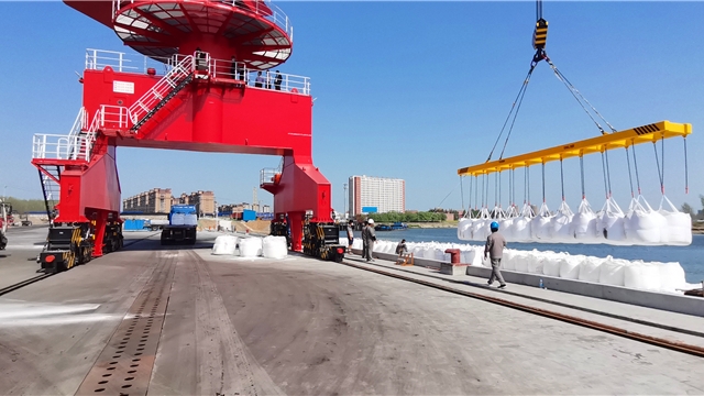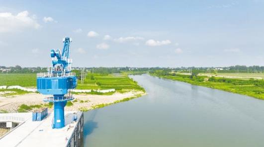 盛夏七月,在項城市東部的項城港,幾架“高聳入云”的新式固定式起重機(jī)的主體已安裝完畢,剩余的部件堆放在地上,巨大的框架和鮮紅的涂裝展示著它們的力量。一側(cè),千噸級貨輪正停靠在長長的泊位前,起重機(jī)緩緩卸下貨艙內(nèi)的散貨。