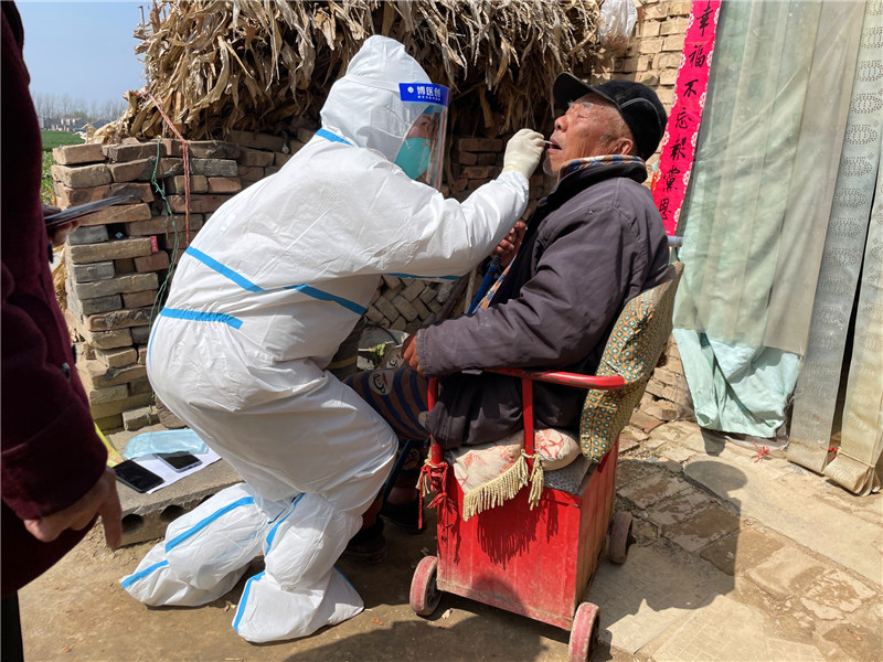 3月23日至4月13日,喬晶每天凌晨出發(fā),穿著密閉的防護(hù)服連續(xù)22天在太康馬廠工作。4月2日起,所有行政村實(shí)行入戶(hù)采集。從全民采樣到入戶(hù)采樣、封控人員實(shí)行一戶(hù)一管、重點(diǎn)管控人員一人一管、二十人混管到單管,加之村莊大、人員居住分散等,喬晶和她的同事面臨的是巨大挑戰(zhàn)!援太期間,每天都是30多攝氏度的高溫天氣,喬晶穿著密不透風(fēng)的防護(hù)服,戴著防護(hù)帽、防護(hù)面屏、口罩、手套,幾分鐘便汗如雨下。對(duì)此,她無(wú)怨無(wú)悔。